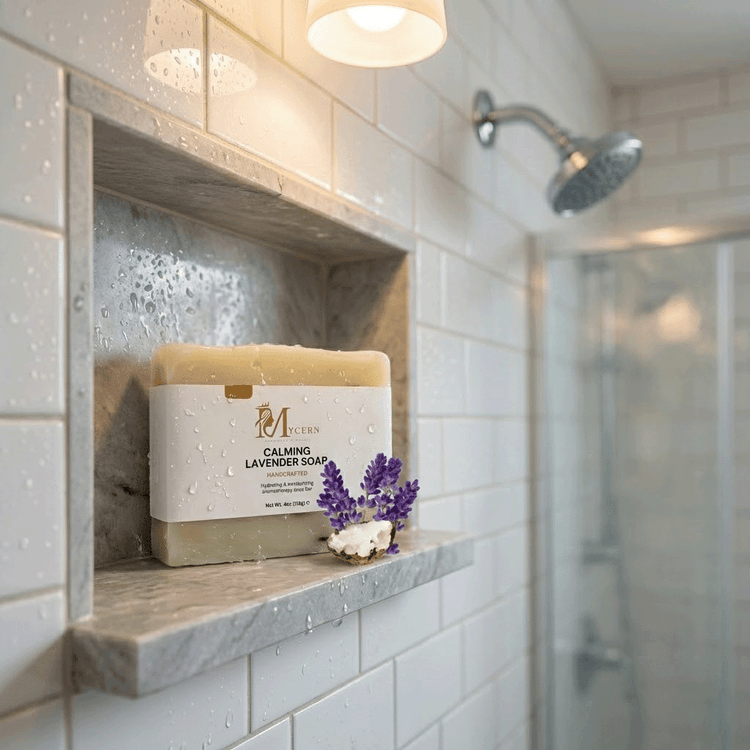 Handcrafted lavender soap with shea butter, organic oils, and soothing lavender to hydrate and cleanse without irritation.