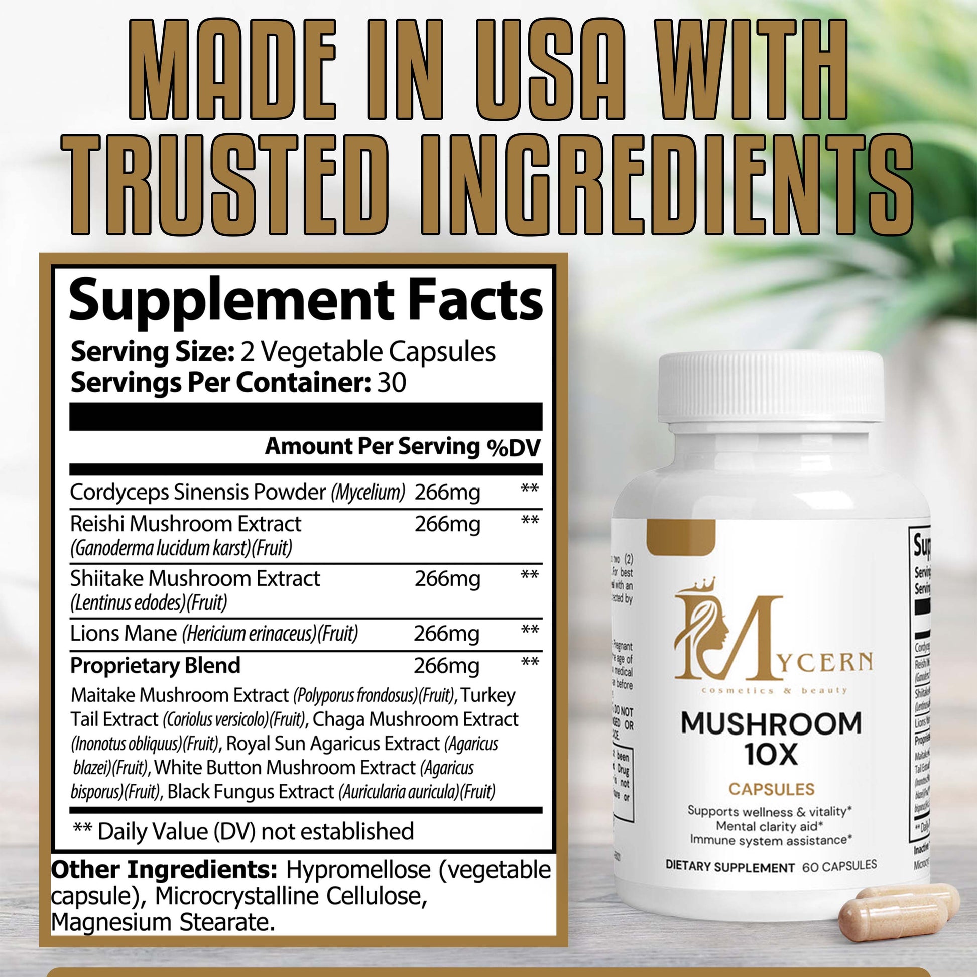 Ingredients: Cordyceps Sinensis Powder, Reishi Mushroom Extract, Shiitake Mushroom Extract, Lions Mane, Proprietary Blend (Maitake Mushroom Extract, Turkey Tail Extract, Chaga Mushroom Extract, Royal Sun Agaricus Extract, White Button Mushroom Extract, Black Fungus Extract, Hypromellose (vegetable capsule), Microcrystalline Cellulose, Magnesium Stearate.