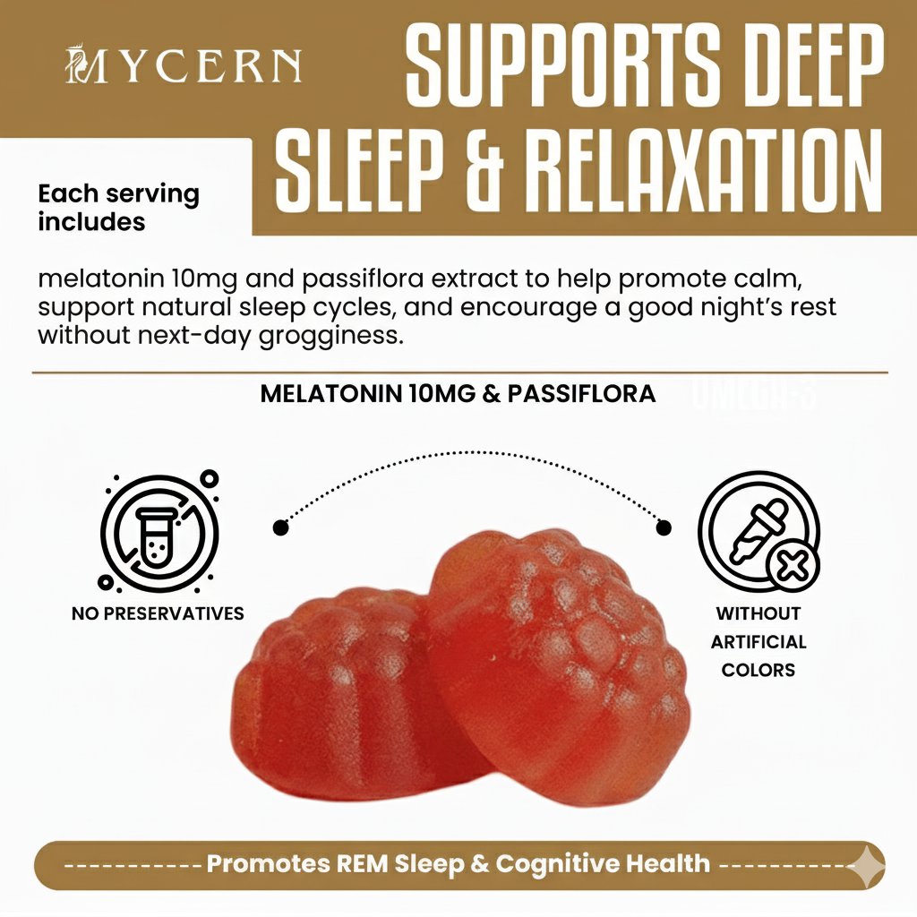 Struggling to unwind at night or stay asleep through the night? Mycern Sleep Support Gummies are thoughtfully crafted to help you experience deep sleep and support your body’s natural calm response without dependency. These melatonin gummies combine melatonin 10mg with passiflora extract to help you fall asleep faster, enhance REM sleep, and support cognitive and emotional well-being.